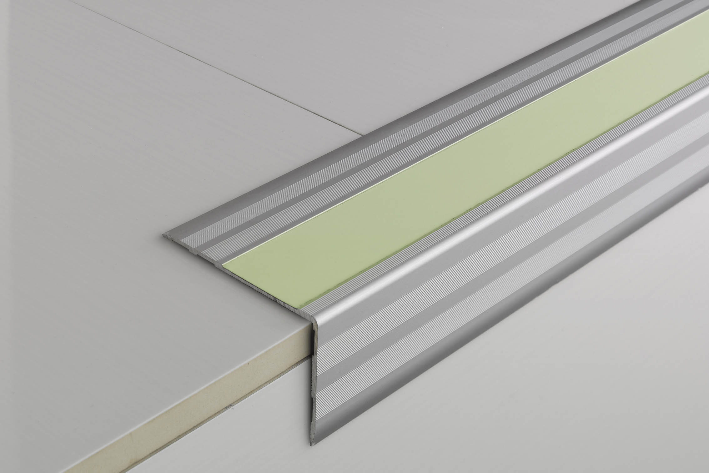 Perfiles que aportan seguridad en 2 aspectos. Por un lado, su banda fotoluminiscente permite indicar la vía de evacuación en caso de oscuridad repentina. Por otro lado, su superficie estriada antideslizante aporta mayor seguridad ante posibles caídas.
