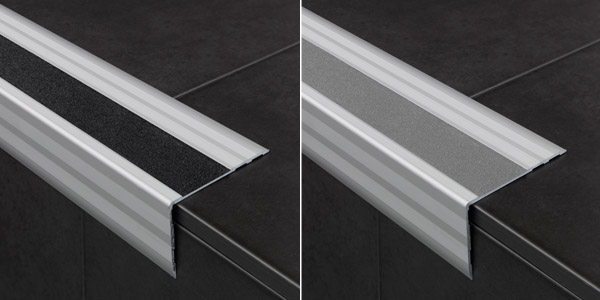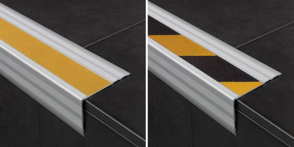 Ampliamos nuestra gama Novopeldaño® Safety con nuevos colores de banda. Por un lado, al acabado negro original, se suma un nuevo color de banda gris, discreto y elegante, que se integra perfectamente con el color del aluminio.