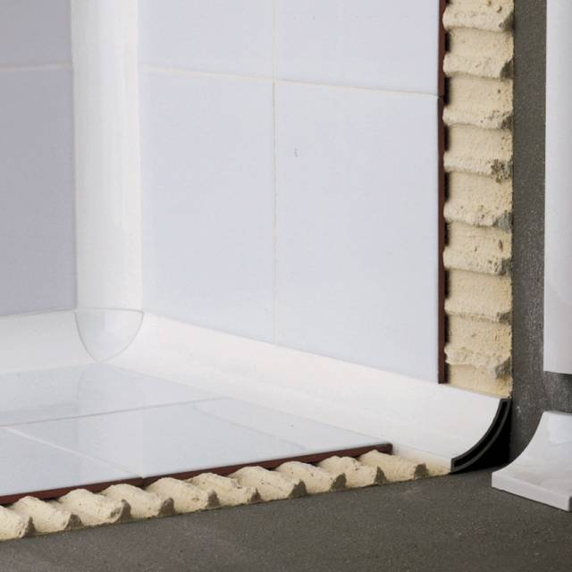 Perfil de media caña reversible. Permite rematar en pared tanto esquinas (colocado de forma convexa) como rincones (colocado de forma cóncava). Facilita la limpieza y evita la acumulación de suciedad.