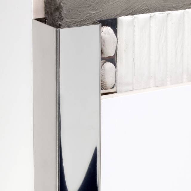 Escuadra de amplia cara vista fabricada en acero inoxidable AISI304, diseñada para proteger las aristas exteriores de las instalaciones. Por su diseño, proporciona un acabado de gran belleza y resistencia.