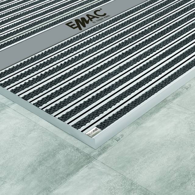 Se compone del modelo Novomat 8®, con moqueta textil de color gris, para uso en interior, y con el perfil marco cortado a medida.