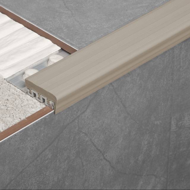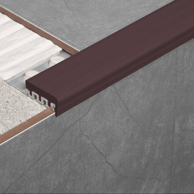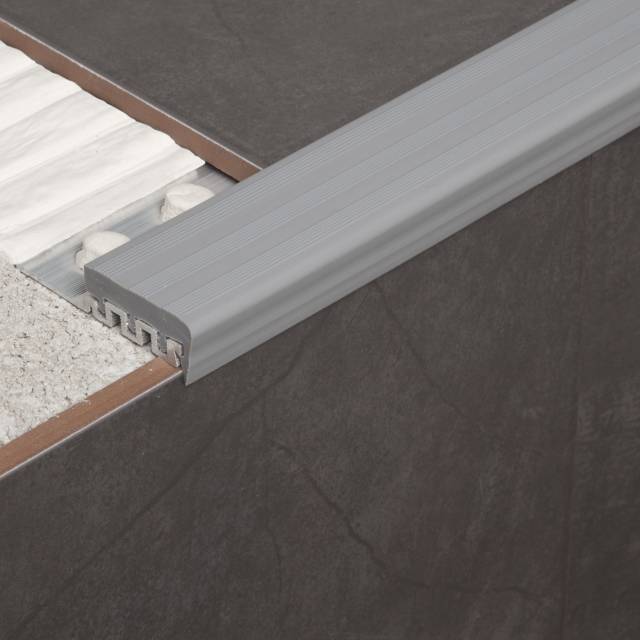 Remate para escaleras de aluminio con huella interior antideslizante de PVC en una base de aluminio.
