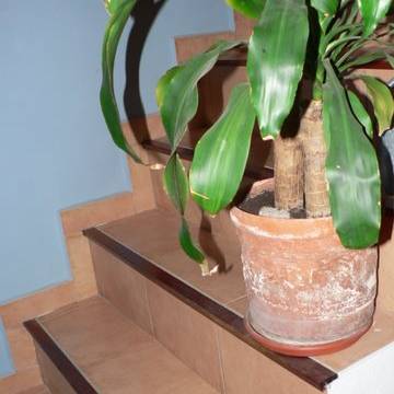 Peldaño de madera natural 100% con huella sobre una robusta base de aluminio. Ideal como remate para escaleras revestidas con gres rustico o madera.