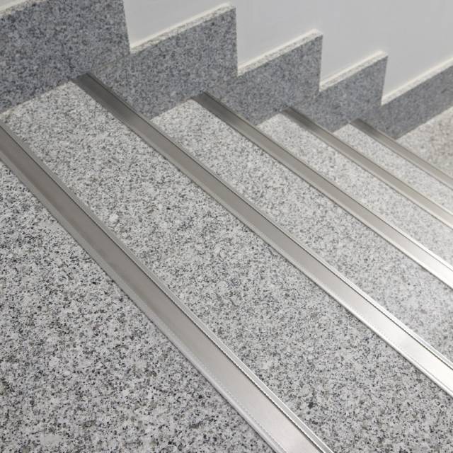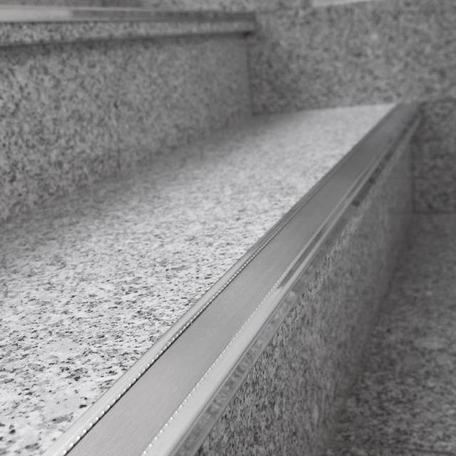 Espectacular remate decorativo para peldaños fabricado en acero inoxidable AISI-304. Su superficie antideslizante mejora el valor de resistencia al deslizamiento (Rd) del pavimento al que complementa, favoreciendo el cumplimiento del Código Técnico de la Edificación (C.T.E.).