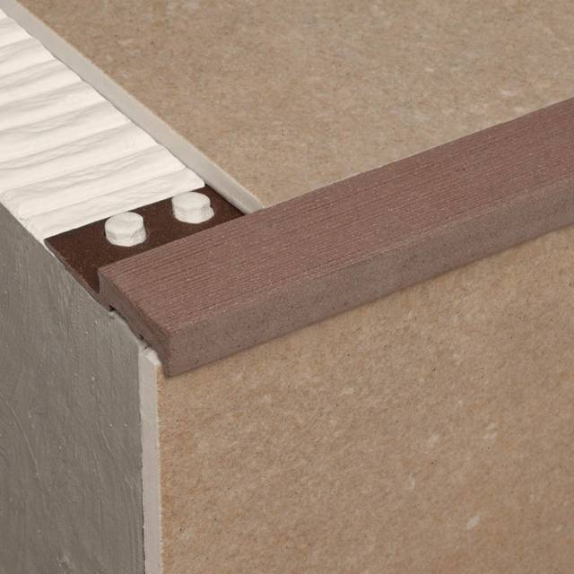 Perfil para remate de peldaños fabricado en Maxi, material exclusivo de Emac® perteneciente a la familia de los WPC (Wood Plastic Composites) que incorpora fibras vegetales en su composición y contribuye, de esta manera, a la conservación del Medio Ambiente. Maxi es un material muy resistente que ha sido sometido a múltiples ensayos para certificar sus excelentes propiedades.