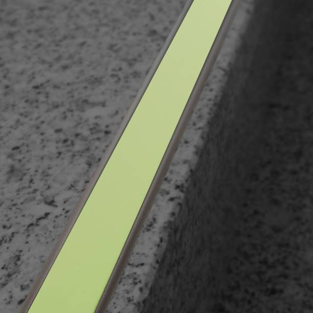 Pletina fabricada en aluminio anodizado plata mate con inserto de banda fotoluminiscente que sirve de guía en caso de ausencia de luz.